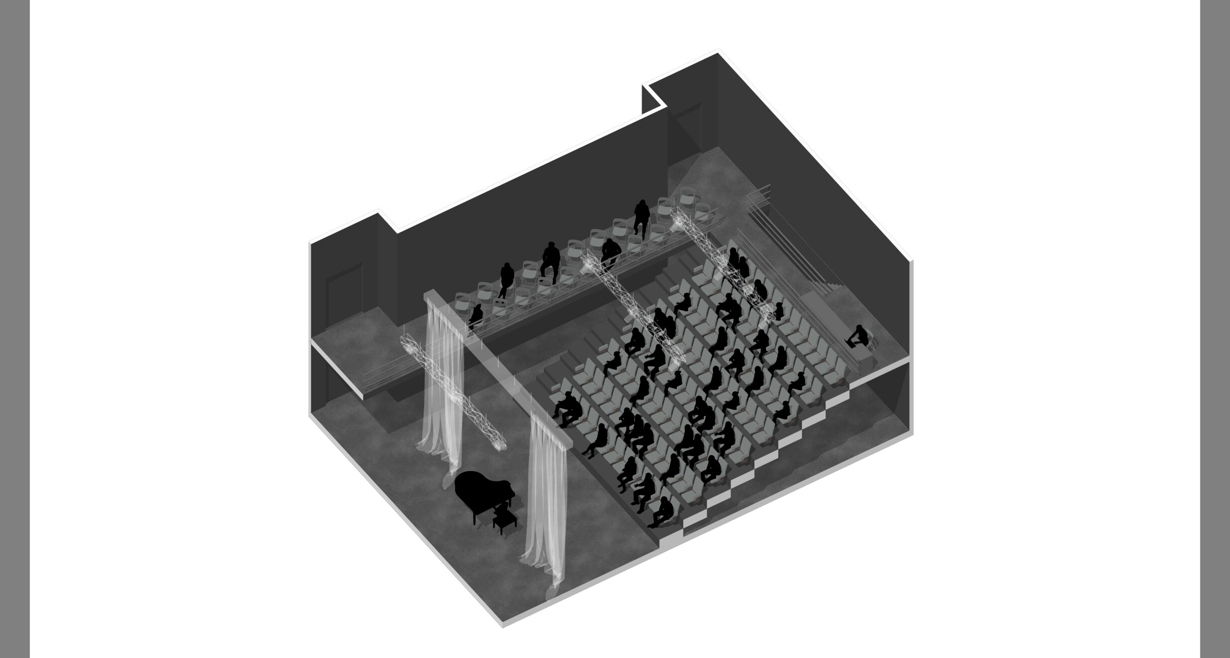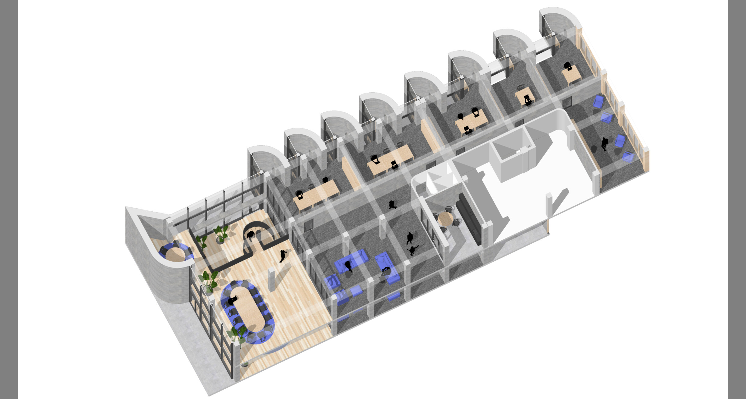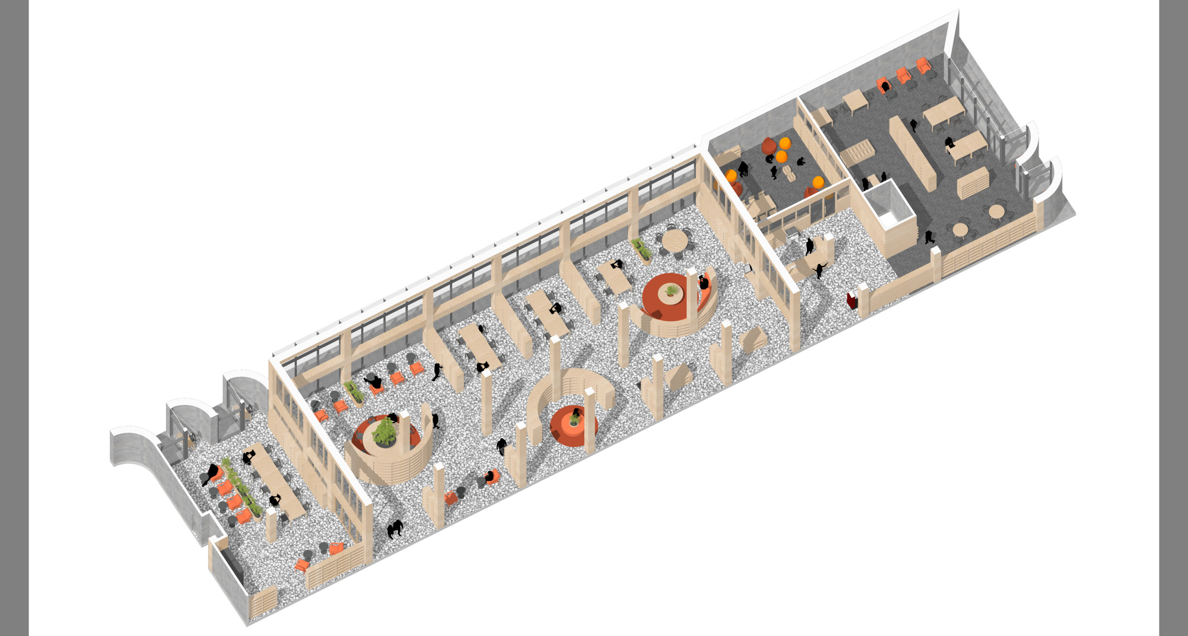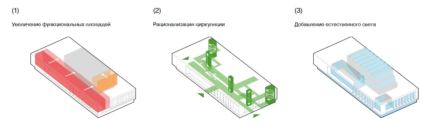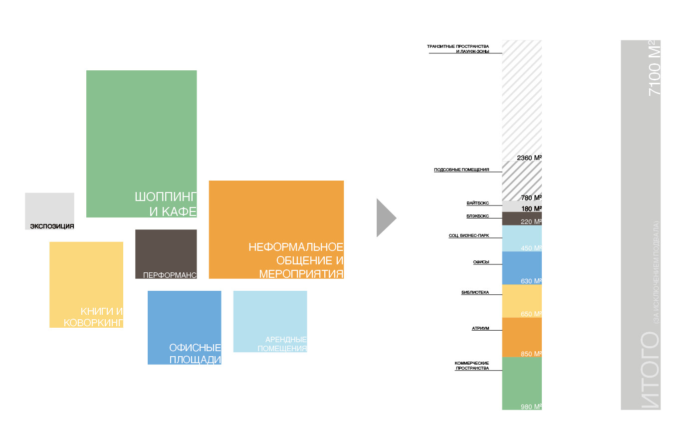 На этапе исследования были выявлены ключевые запросы жителей: потребность в современной библиотеке, многофункциональной выставочной площадке, пространстве для событий, образовательных аудиториях и коммерческих сервисах. За основу нашей работы была взята концепция предыдущей архитектурной команды — здание в духе позднесоветского модернизма, организованное вокруг трёхсветного атриума, который задумывался как крытая городская площадь. Наша работа началась с анализа и развития существующей планировочной структуры. В фокусе было формирование функциональной схемы: повышение эффективности площадей, оптимизация маршрутов движения и максимальное использование естественного освещения.