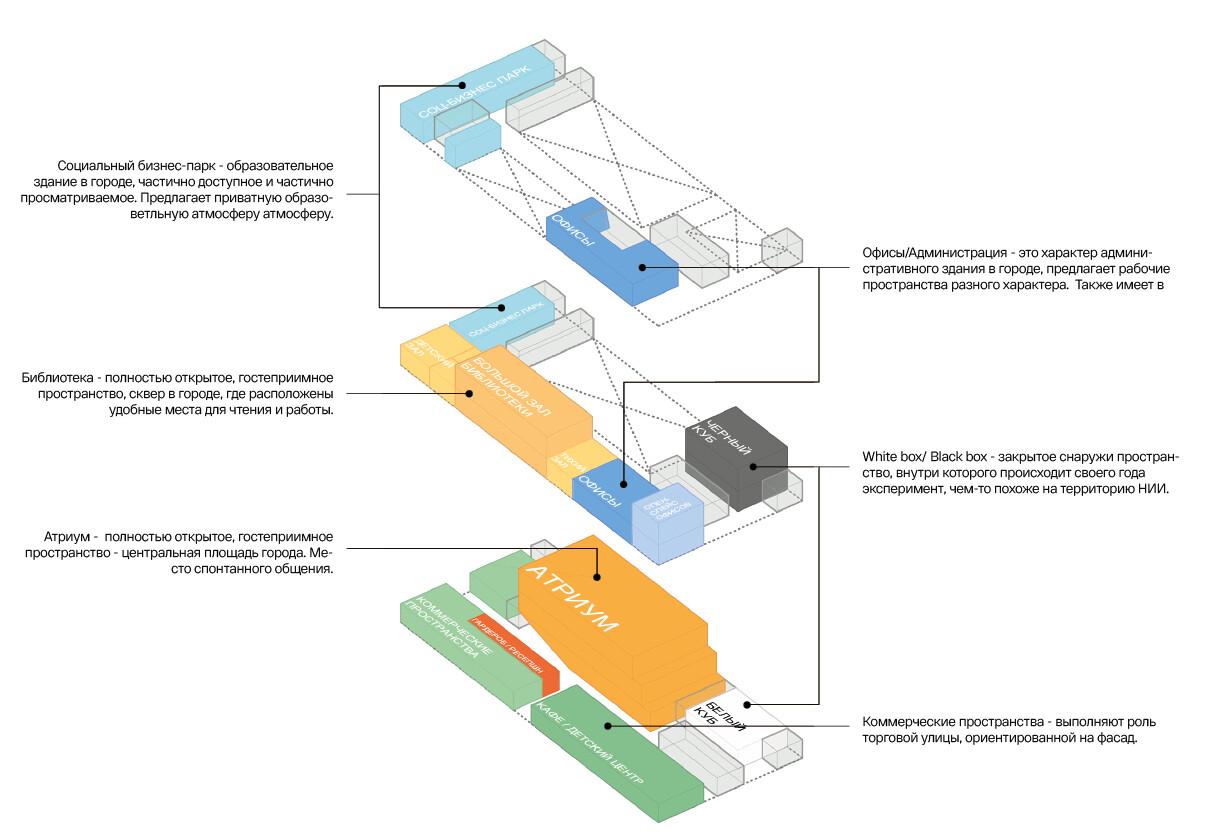 Затем мы преобразовали функциональное задание и данные исследований в архитектурную концепцию. За основу взяли метафору «город в здании»: центральный атриум остался главной площадью, а каждое помещение — отдельным «зданием» с собственным характером. Их «фасады» выходят в общие пространства, создавая сложную среду, где приватность сочетается с открытостью. Этот принцип напрямую перекликается с оригинальной планировкой Черноголовки, построенной на контрастах закрытости и открытости среды.