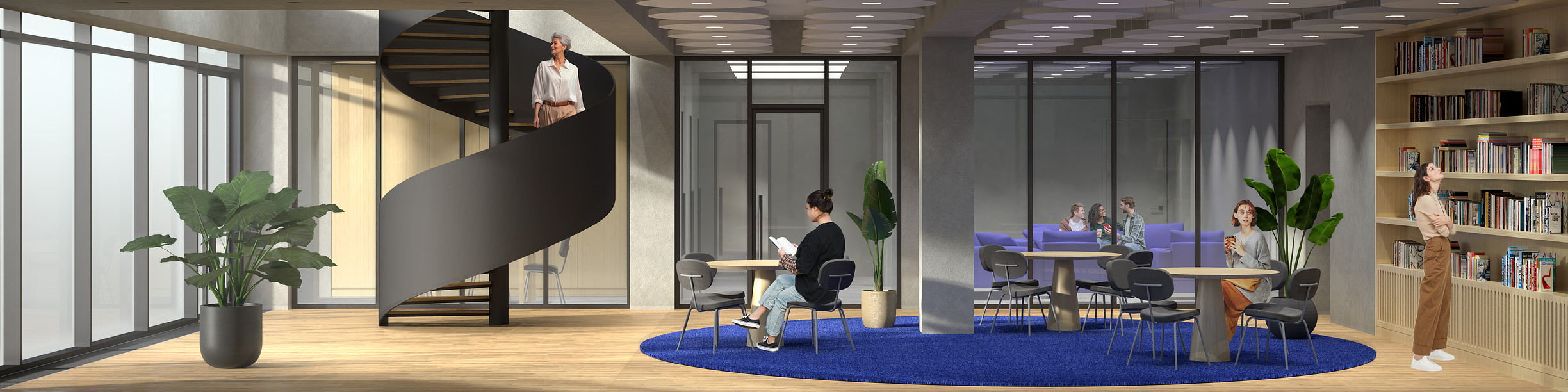 Библиотека — «сквер» с зонами для тихой работы и общения, где посетитель может найти уединение среди книг.