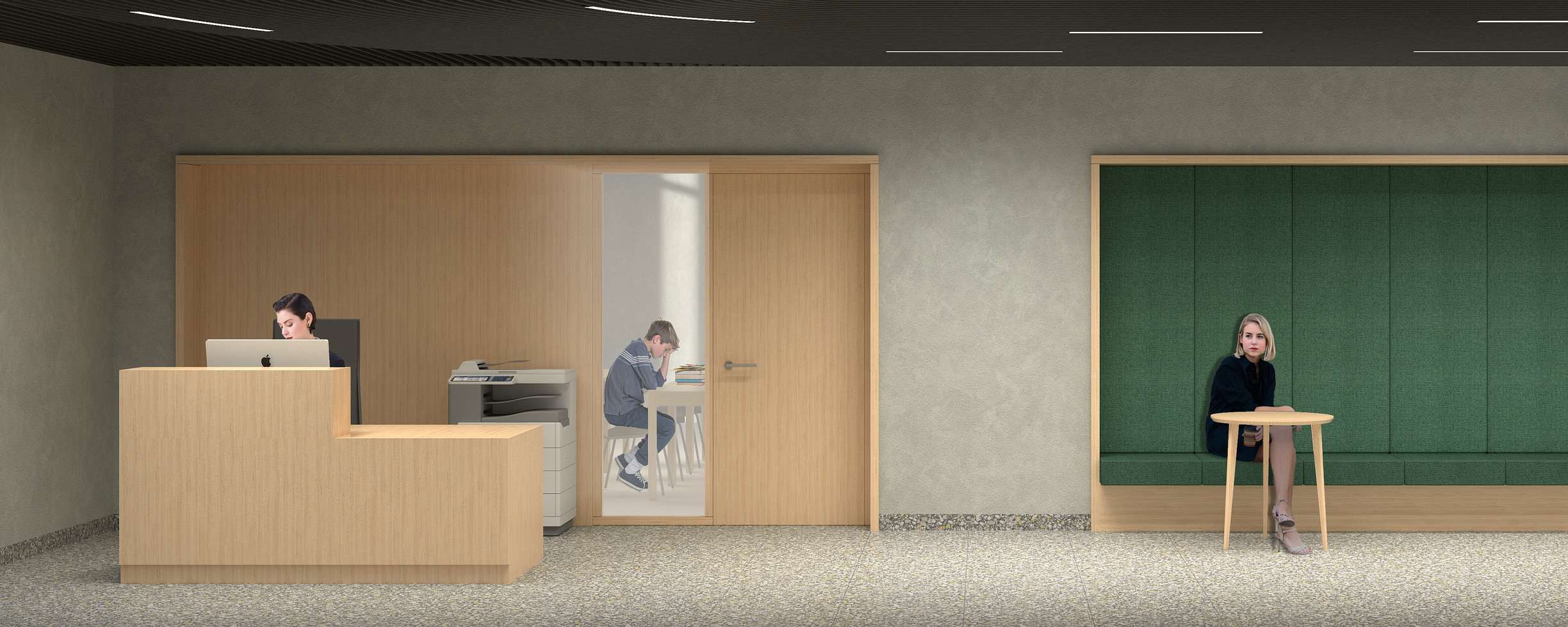 натуральный шпон светлого дуба в открытых общественных пространствах (библиотека, атриум);